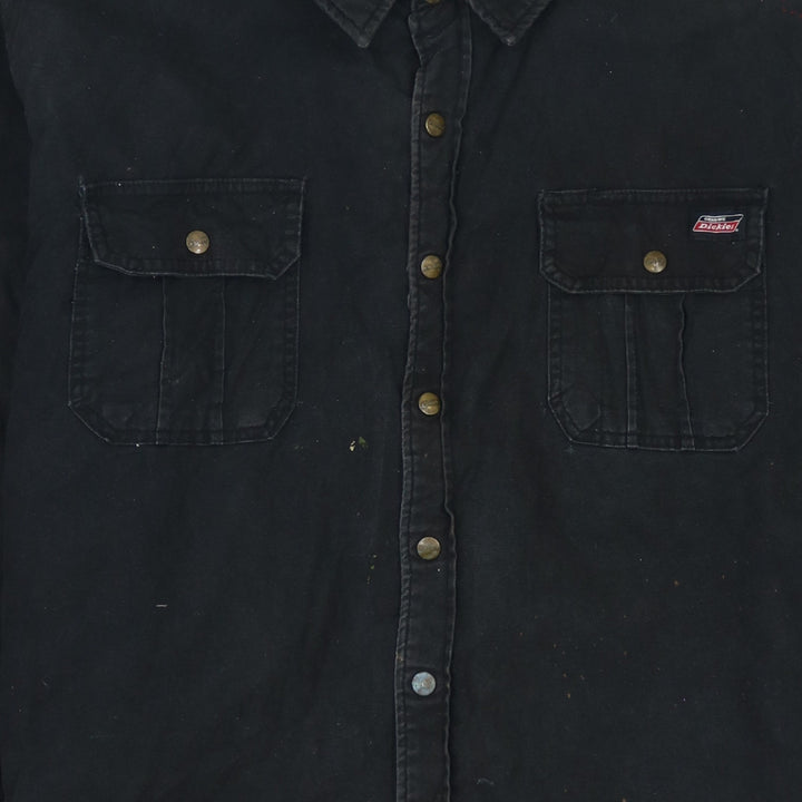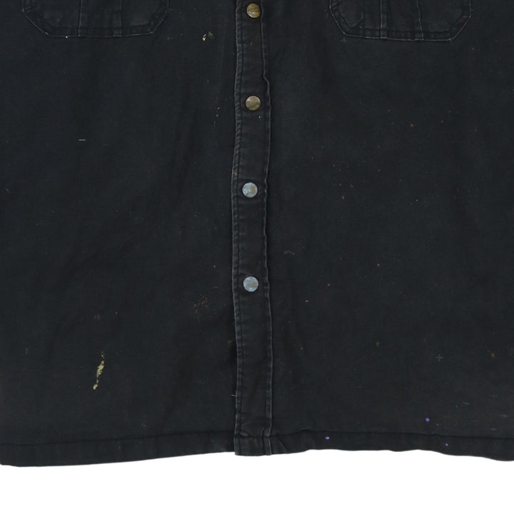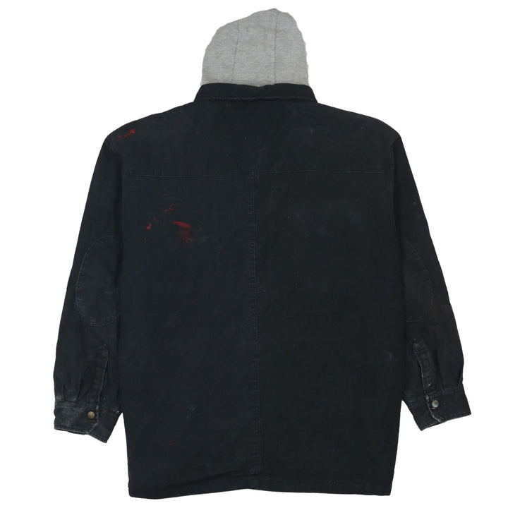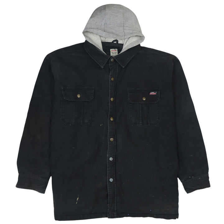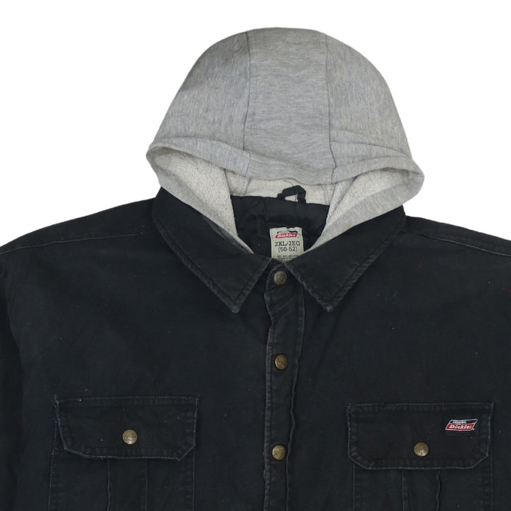 Dickies, Dickies jacket, Dickies work jacket, Dickies hooded jacket, black Dickies coat, black hooded work jacket, men’s Dickies 2XL, 2XL work jacket, oversized work jacket, black cotton jacket, shirt jacket, shacket, hooded shacket, button front jacket, button up coat, chest pocket jacket, carpenter style jacket, workwear outerwear, casual outerwear, black hooded coat, lined work jacket, quilted lining jacket, relaxed fit jacket, men’s black coat, men’s hooded coat, utility jacket, everyday jacket, durable jacket, heavyweight cotton jacket, grey hood jacket, layered look jacket, paint splatter jacket, distressed work jacket, B grade jacket, pre-owned Dickies, men’s 2XL coat, carpenter coat, outdoor jacket, casual work coat, longline jacket, street casual jacket, winter layer, autumn jacket, layering piece, classic workwear, Dickies logo patch, button cuff sleeves