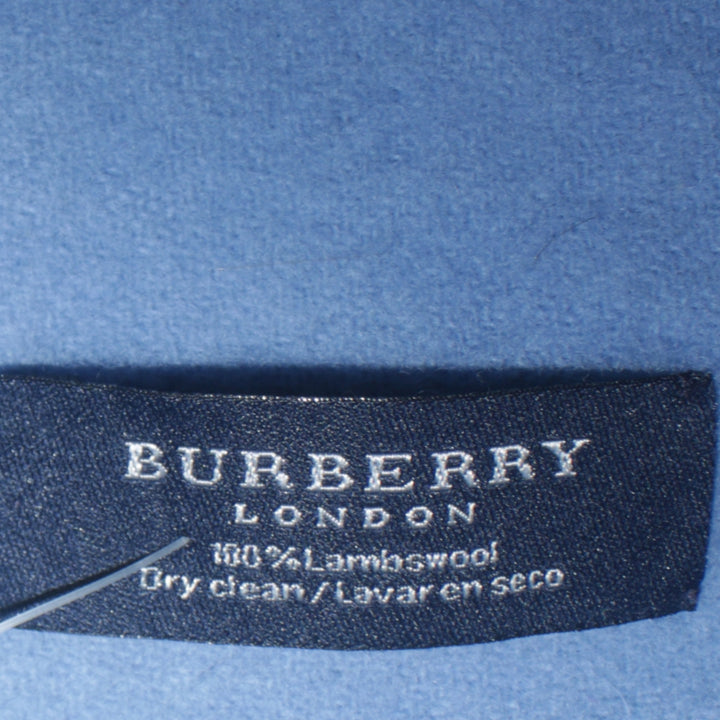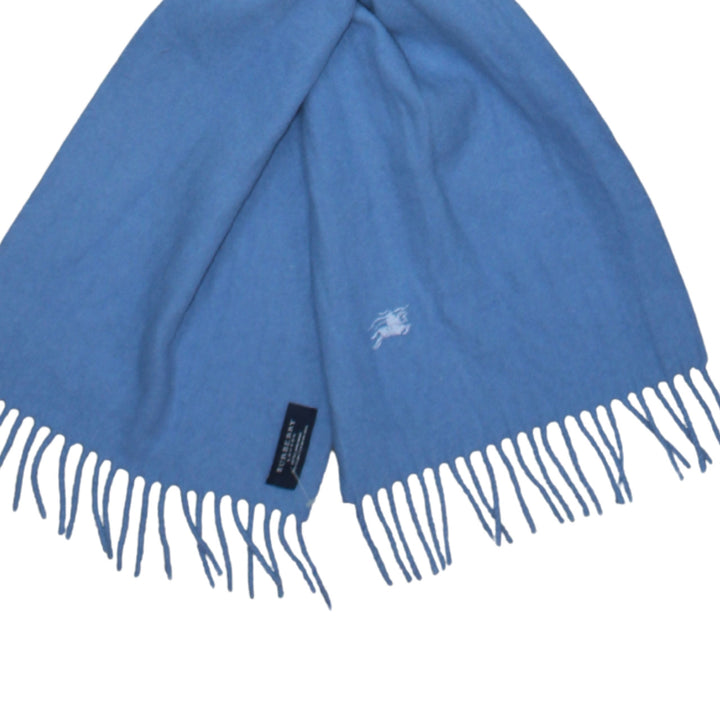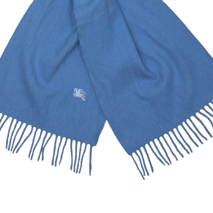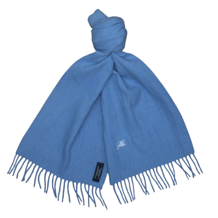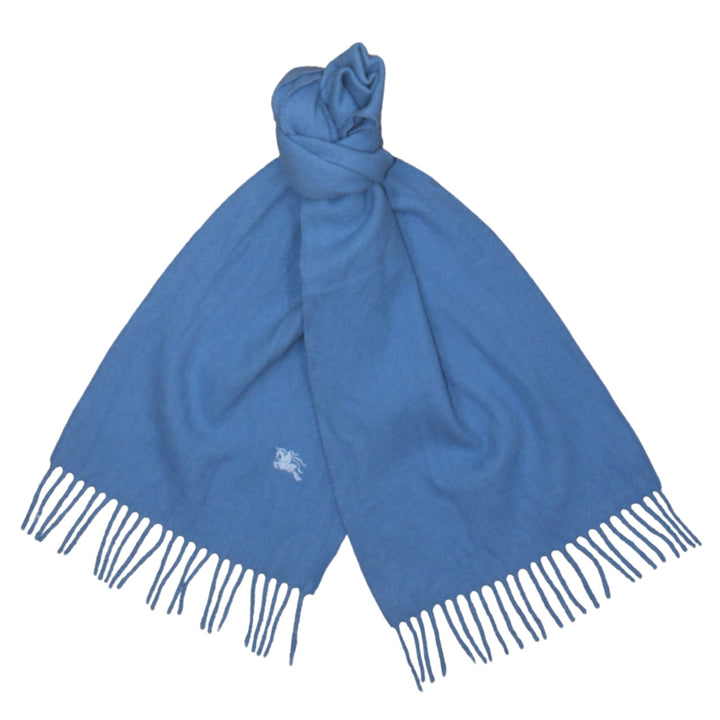 Burberry Light Blue Scarf Men’s One Size Embroidered Equestrian Logo Fringed Wool Silk