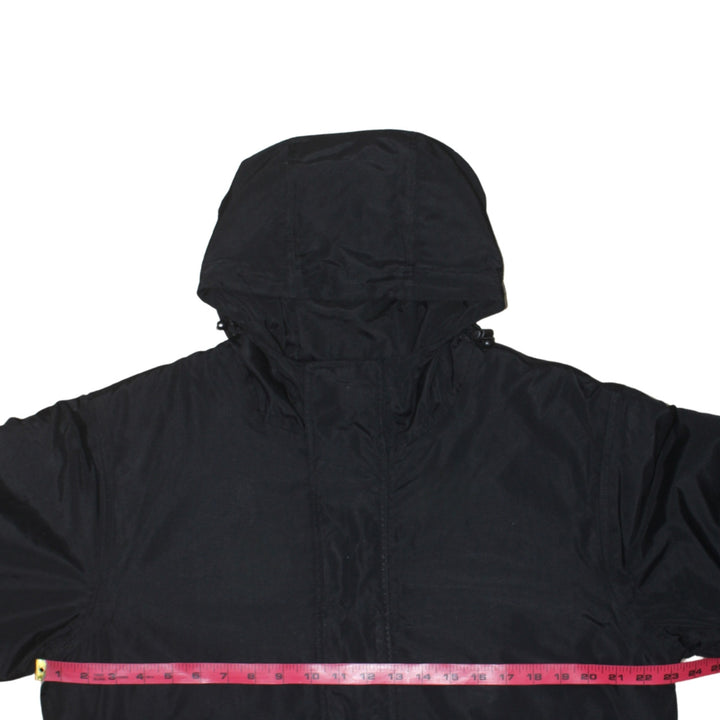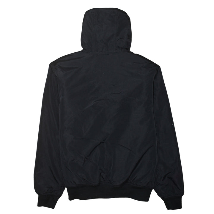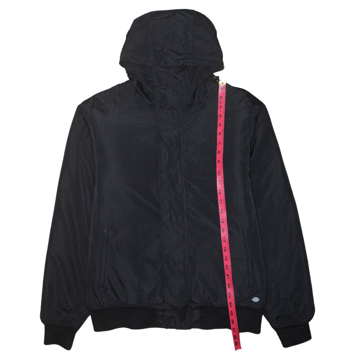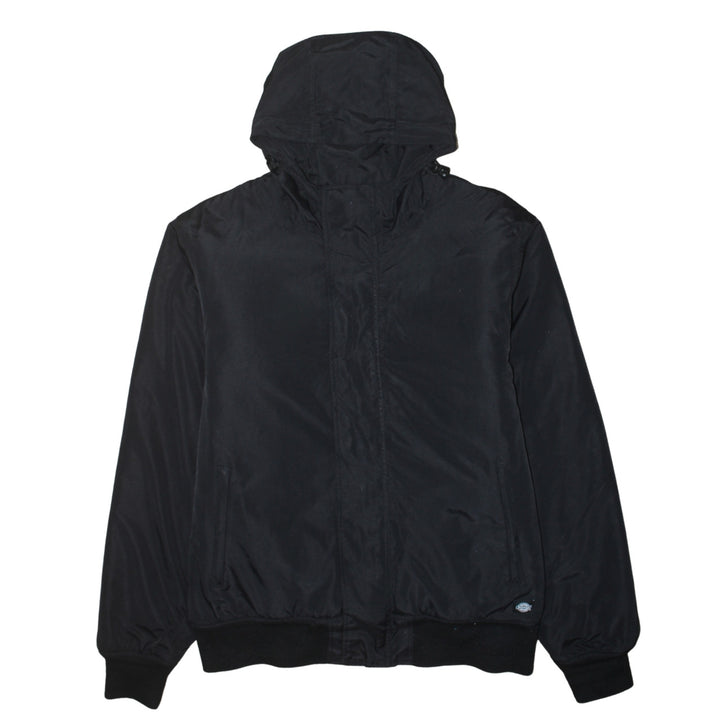 Dickies, Dickies jacket, Dickies hooded jacket, Dickies windbreaker, black Dickies jacket, black hooded jacket, black nylon jacket, men's Dickies, men's jacket, men's hooded jacket, men's windbreaker, size large jacket, large hooded jacket, workwear jacket, work jacket, casual jacket, everyday jacket, nylon shell jacket, polyamide jacket, lined jacket, fleece lined body, cotton blend lining, polyester lining, full zip jacket, zip front jacket, ribbed hem jacket, ribbed cuffs jacket, lightweight outerwear, transitional jacket, casual outerwear, black coat, men's outerwear, street jacket, bomber style jacket, hooded coat, basic black jacket, core wardrobe piece, layering jacket, autumn jacket, spring jacket, winter layering, relaxed fit jacket, oversized fit jacket, 23 inch pit to pit, 24 inch length, 23 inch sleeve, small mark on arm, pre-owned Dickies, second hand Dickies, classic workwear style, durable jacket, practical jacket, everyday wear, casual wear, outdoor wear