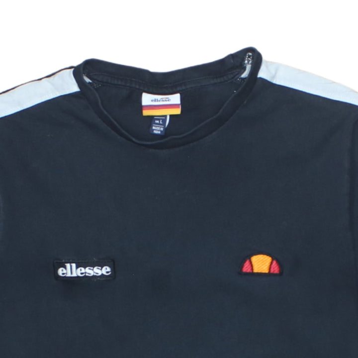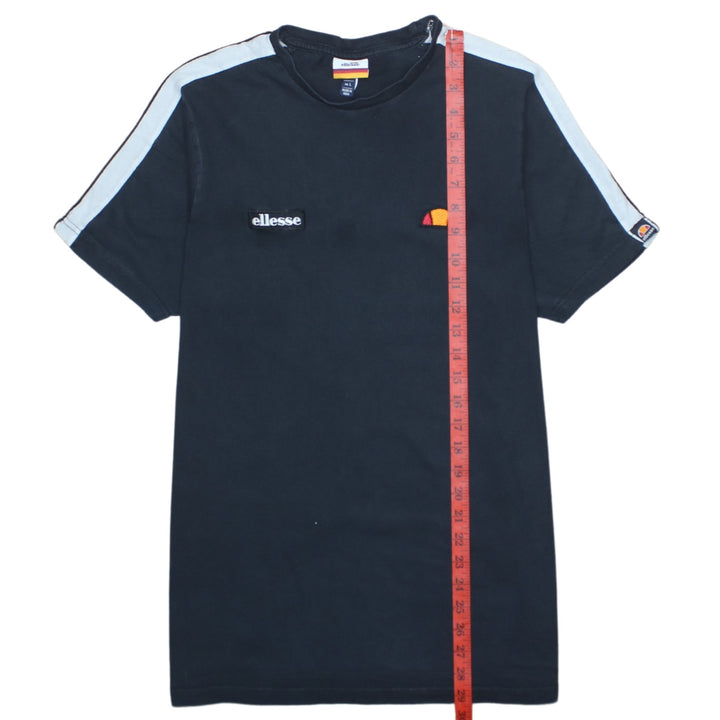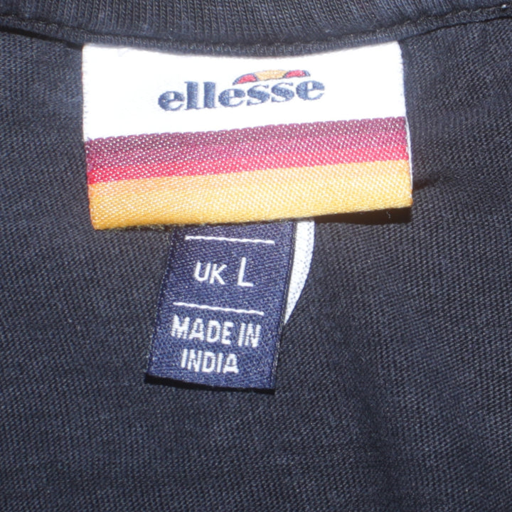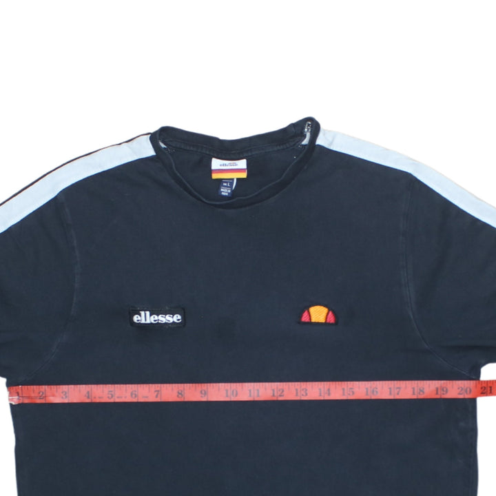 Ellesse Black T Shirt Women’s Large Embroidered Chest Logos Contrast Shoulder Stripe Tee Top