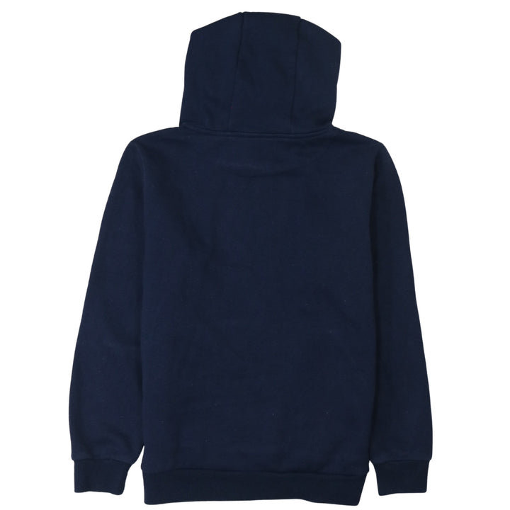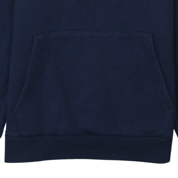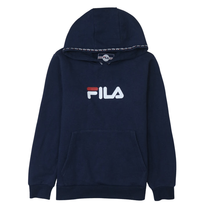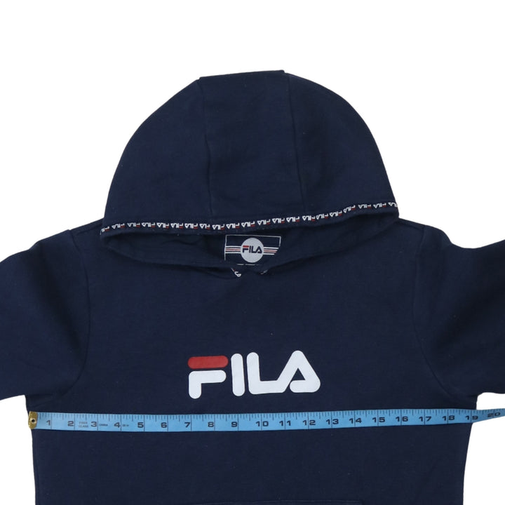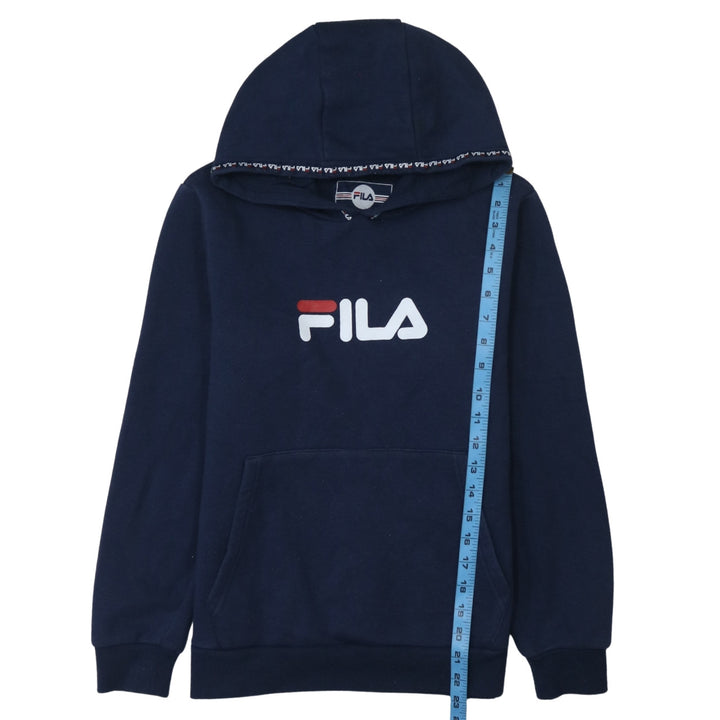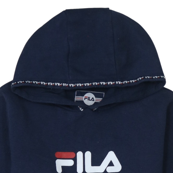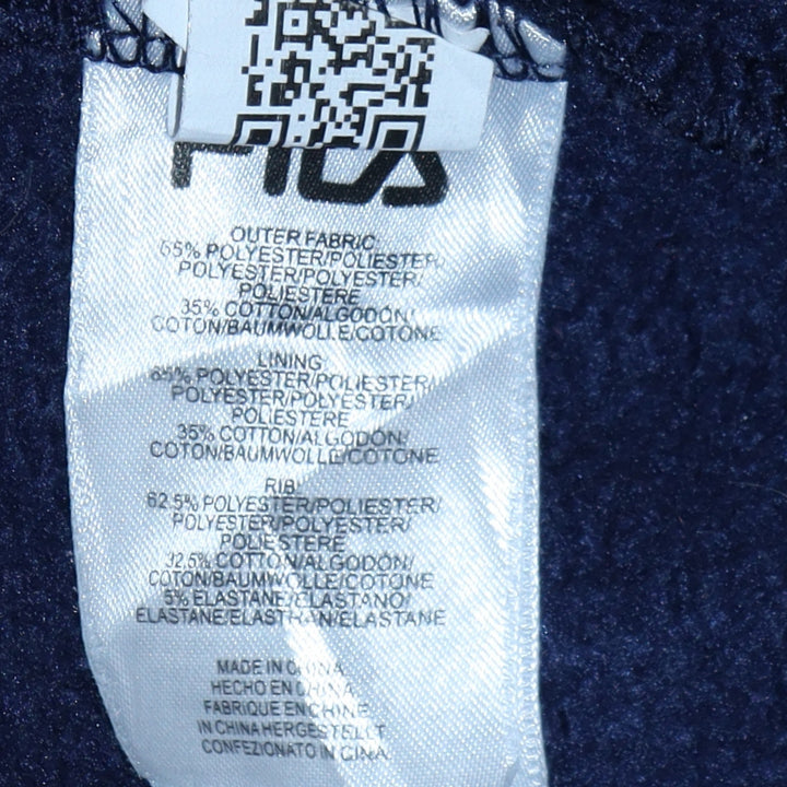 This Fila hoodie in a deep navy colour is a perfect blend of style and comfort, fitting a size Medium. The outer fabric is made of 65% polyester and 35% cotton, offering durability and softness. The lining provides additional warmth, also composed of 65% polyester and 35% cotton. The ribbing features a mix of 62.5% polyester, 32.5% cotton, and 5% elastane for a snug fit. This piece originates from China and embodies the sporty aesthetic of the early 2000s. Ideal for layering or wearing on its own, it's a versatile addition to your casual wear collection.