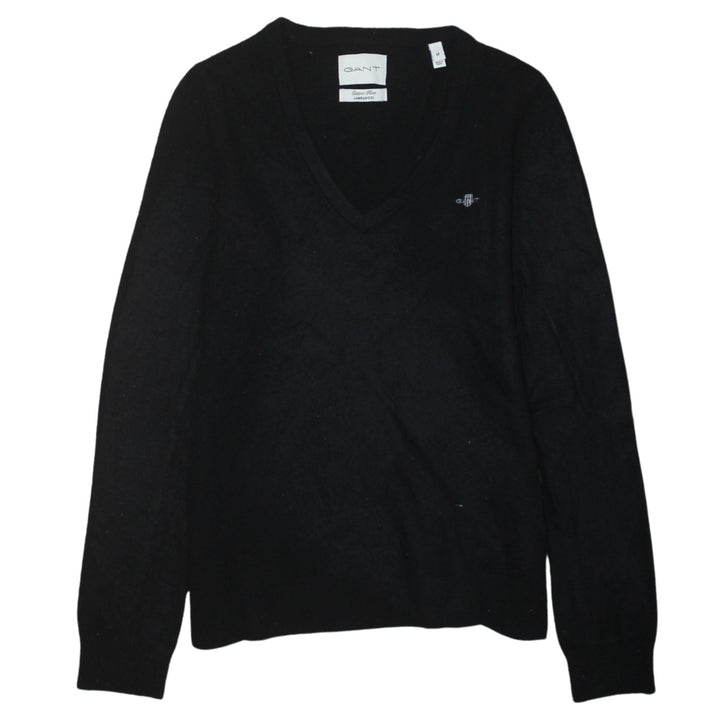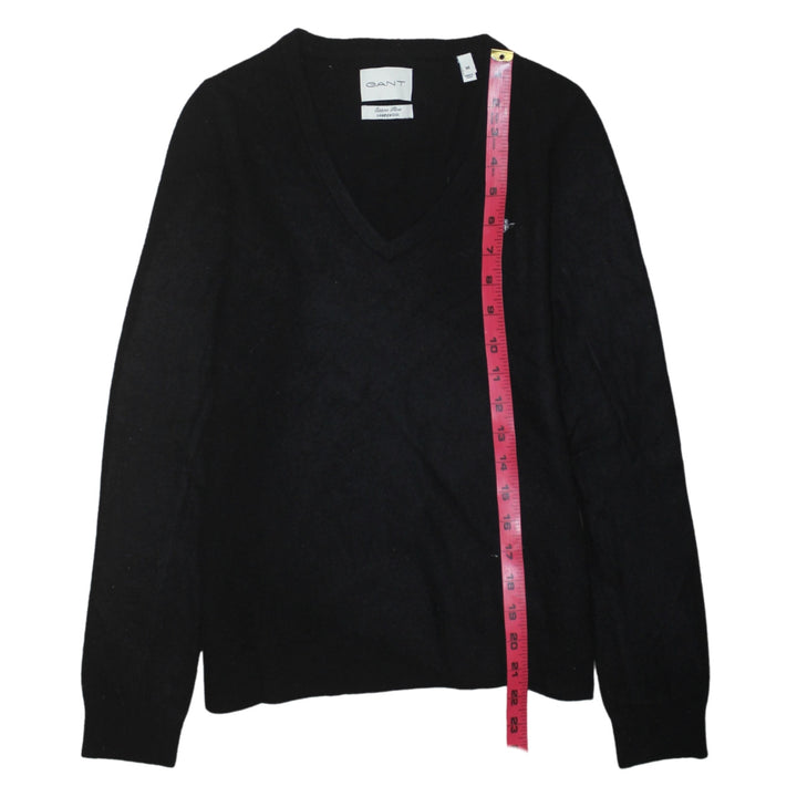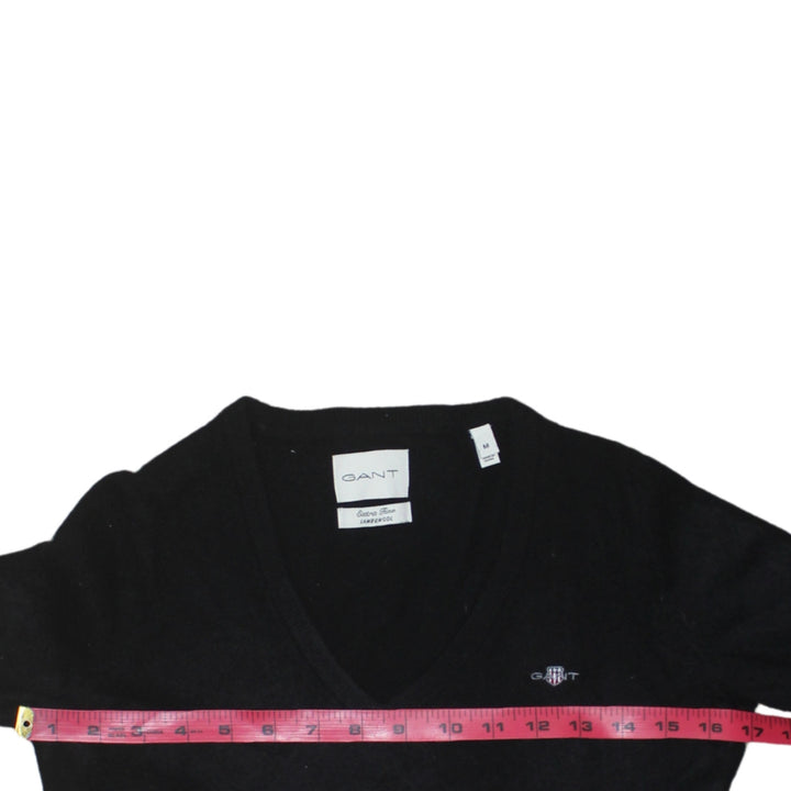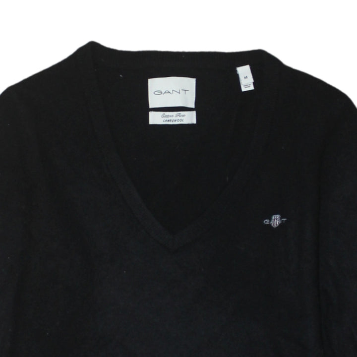 GANT Black V Neck Jumper Women’s Medium Embroidered Chest Logo Knit Sweater Pullover