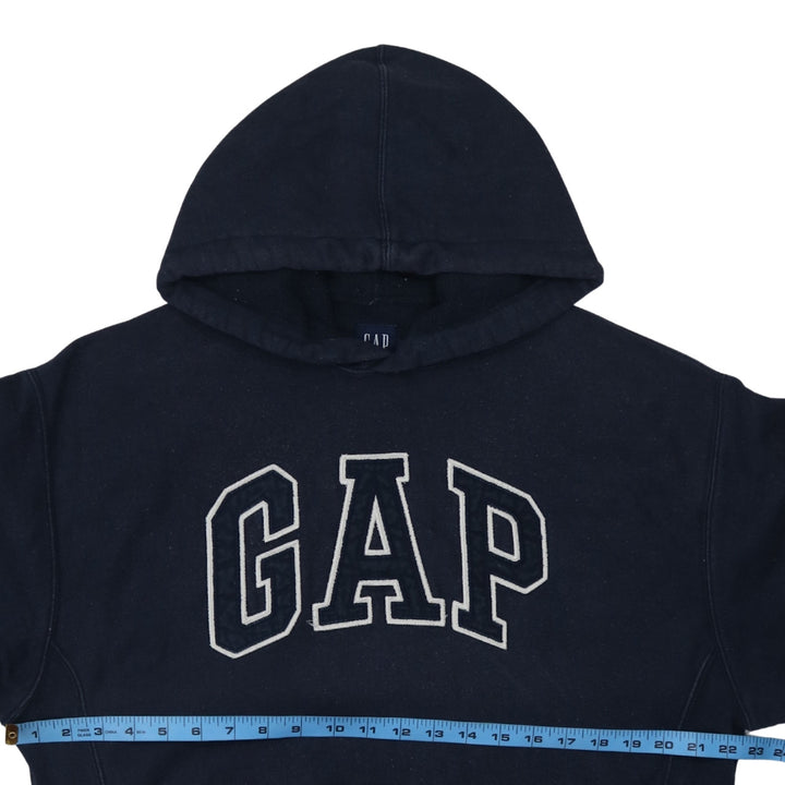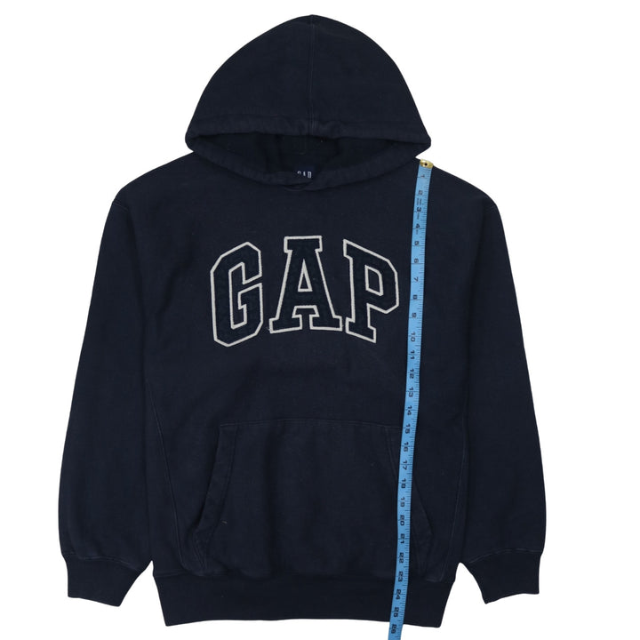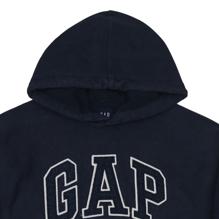 Key Features: Navy blue cotton blend, bold embroidered GAP logo, cosy hood, front pocket
