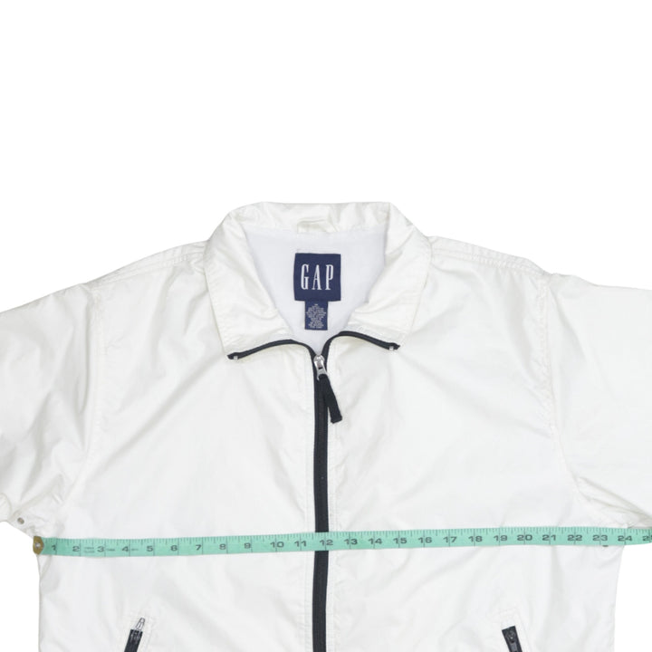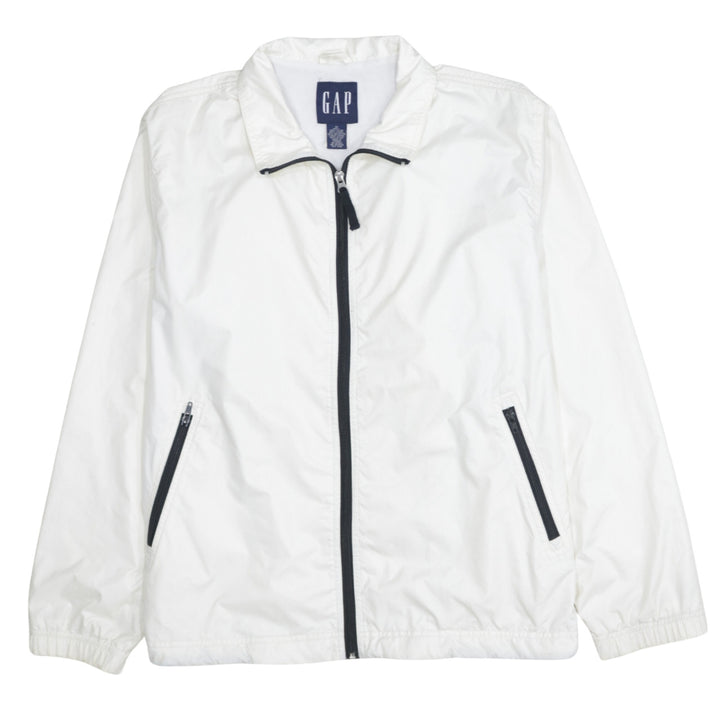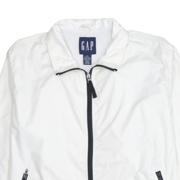 Gap, Gap jacket, Gap windbreaker, Gap track jacket, Gap outerwear, white Gap jacket, white windbreaker, white track jacket, men's Gap jacket, men's white jacket, men's windbreaker, men's track top, men's lightweight jacket, size medium jacket, M jacket, relaxed fit jacket, mesh lining jacket, zip front jacket, full zip jacket, contrast zip jacket, black zip pockets, elastic cuffs jacket, elastic hem jacket, minimalist jacket, casual jacket, everyday jacket, lightweight outerwear, spring jacket, summer jacket, layering jacket, nylon feel jacket, polyester cotton jacket, menswear, classic Gap style, clean design jacket, white casual jacket, track style jacket, shell jacket, breathable jacket, athleisure jacket, sportswear jacket, urban jacket, casual top layer, pre-owned Gap jacket, A grade condition jacket