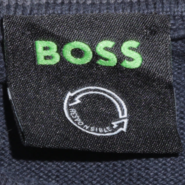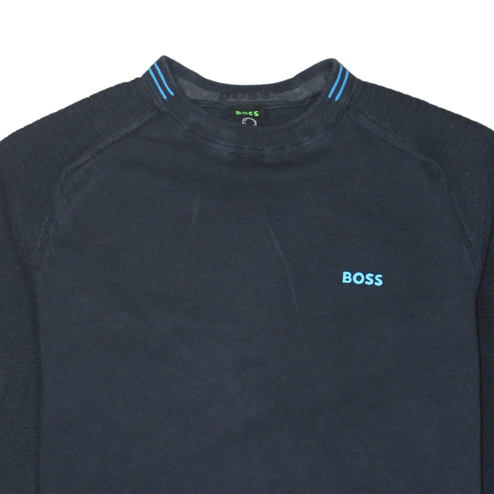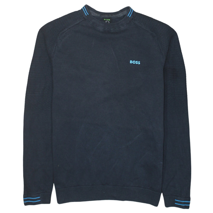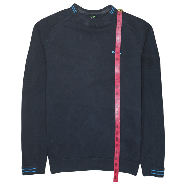 HUGO BOSS sweatshirt, HUGO BOSS jumper, HUGO BOSS pullover, women’s HUGO BOSS top, navy HUGO BOSS sweatshirt, dark navy jumper, blue stripe sweatshirt, embroidered logo sweatshirt, embroidered BOSS logo, women’s medium sweatshirt, M size jumper, crewneck sweatshirt, crew neck jumper, long sleeve pullover, casual cotton jumper, designer sweatshirt, designer casualwear, women’s navy knit top, loungewear top, everyday sweatshirt, classic navy sweater, textured sleeve jumper, ribbed cuff sweatshirt, ribbed hem jumper, minimalist sweatshirt, smart casual sweatshirt, layering piece, autumn jumper, winter sweatshirt, cotton blend sweatshirt, women’s casual clothing, pre-owned HUGO BOSS, second hand designer, sustainable fashion, timeless wardrobe staple, cosy pullover, relaxed fit jumper, chest 18.5 inches, length 25 inches, arm 21 inches, blue logo sweatshirt, knit sweatshirt, premium quality jumper, casual weekend wear, office layering piece, capsule wardrobe knit, womens long sleeve top