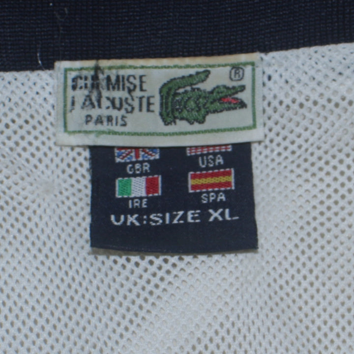 Lacoste, Lacoste jacket, Lacoste windbreaker, Lacoste track jacket, cream Lacoste, beige cream jacket, navy panel jacket, men's Lacoste, men's XLarge jacket, XL Lacoste, full zip jacket, mesh lining jacket, embroidered crocodile logo, designer sports jacket, casual outerwear, lightweight jacket, track top, terrace style, athletic jacket, polyester jacket, wool blend jacket, long sleeve jacket, elasticated cuffs, ribbed collar, striped collar, zip pockets, casual sportswear, everyday jacket, B grade jacket, pre-owned Lacoste, second hand Lacoste, cream windbreaker, men's outerwear, layered look, festival jacket, sporty casual, Lacoste Paris label, classic Lacoste style, embroidered logo jacket, neutral colour jacket, relaxed fit jacket, oversized fit jacket, pit to pit 24, length 27, arm 23, zip through top, mesh lined windbreaker, vintage Lacoste jacket, 90s style Lacoste, cream track top, navy shoulder panels, terrace fashion, casual layering piece, affordable designer jacket, used Lacoste windbreaker