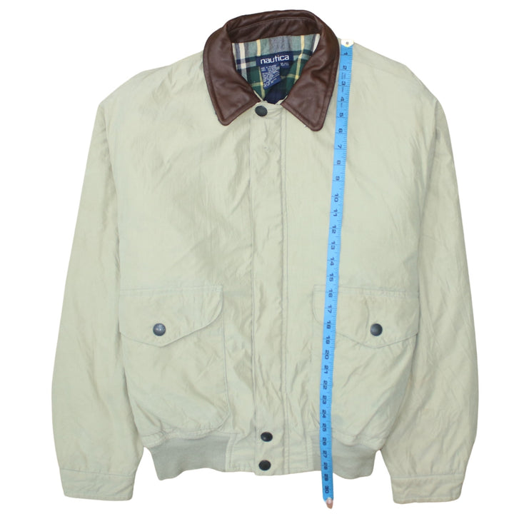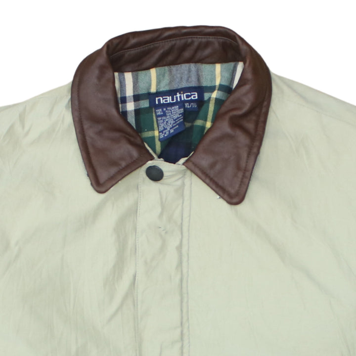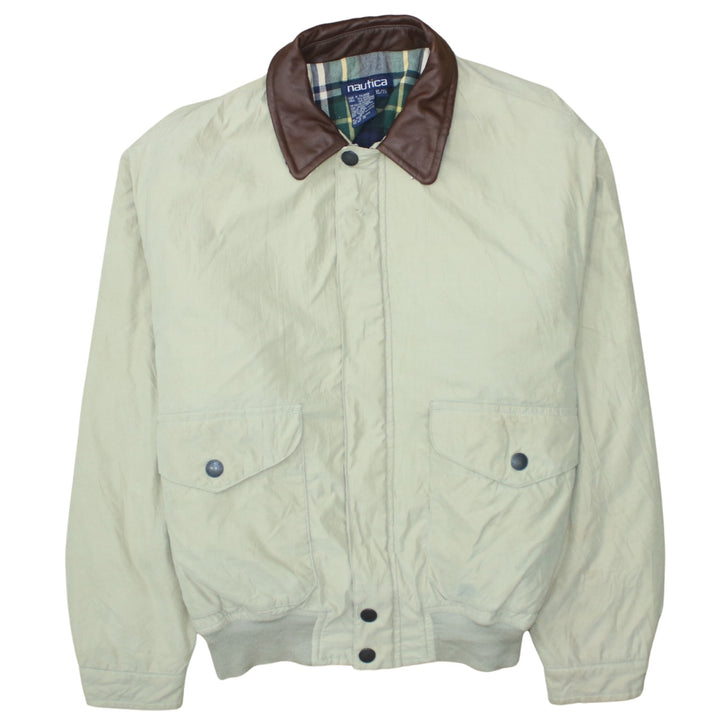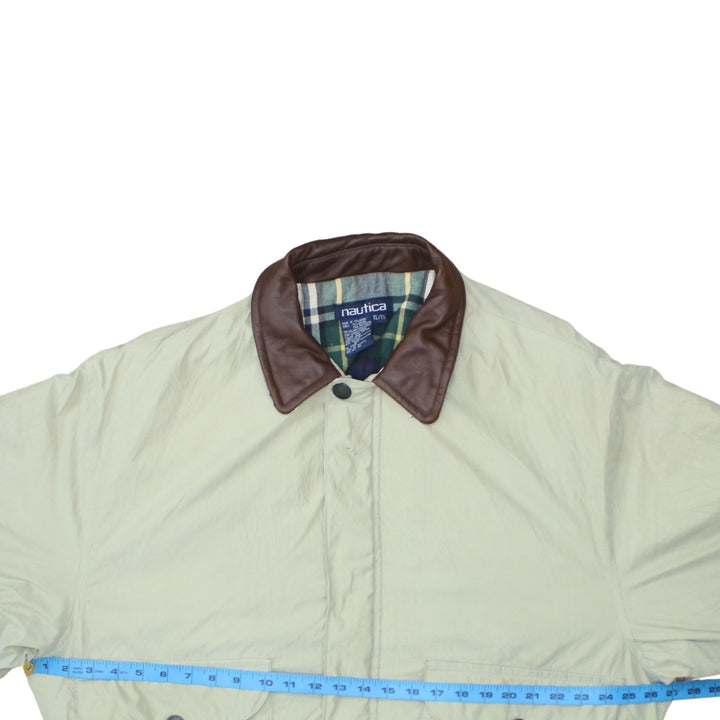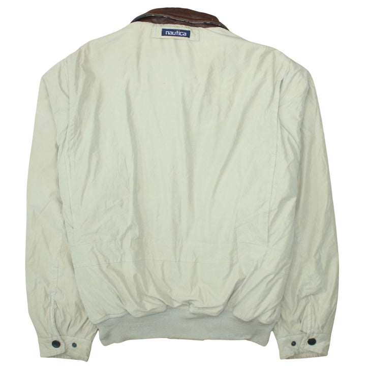 Nautica Beige Cream Jacket Men's XLarge Brown Leather Collar Button Pockets Windbreaker