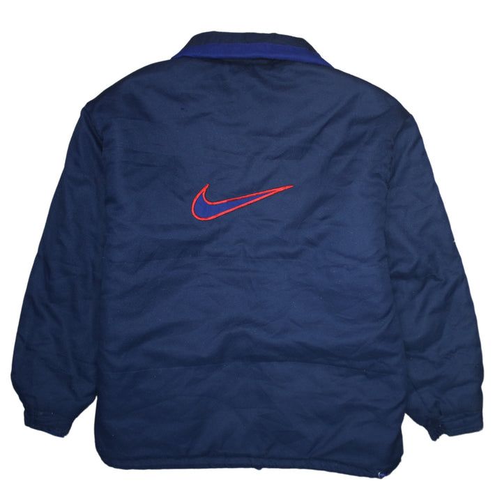 This Nike navy padded jacket is a versatile cold-weather staple, offering reliable warmth and classic sports style. The embroidered Swoosh branding on both front and back gives it a strong visual impact, while the practical zip pockets and elastic trims make it ideal for daily wear. Easy to throw on over a hoodie, sweatshirt or knit, it works perfectly for commuting, casual days out or watching the match. A quality Nike outerwear piece that will stay in your rotation season after season.