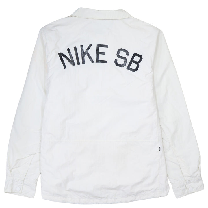 Nike, Nike SB, Nike SB jacket, Nike coach jacket, white Nike jacket, white coach jacket, men's Nike SB, men's white jacket, men's coach jacket, nylon jacket, lightweight jacket, windbreaker, skate jacket, skateboarding jacket, snap front jacket, button up jacket, printed logo jacket, chest logo, back logo, Nike SB outerwear, casual jacket, everyday jacket, layering jacket, street jacket, men's size large, L size jacket, relaxed fit jacket, nylon shell, cotton lining, long sleeve jacket, collared jacket, white windbreaker, SB swoosh logo, branded jacket, logo outerwear, classic Nike SB, A grade condition, second hand Nike, pre-owned Nike jacket, men's fashion, casual outerwear, skate style jacket, white nylon coach, Nike SB white coach jacket