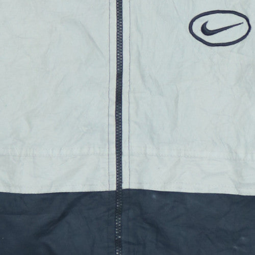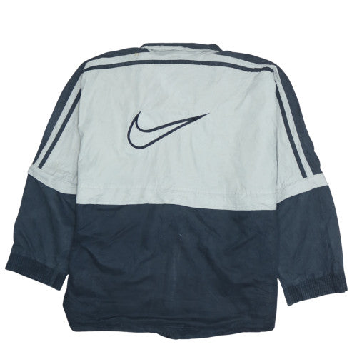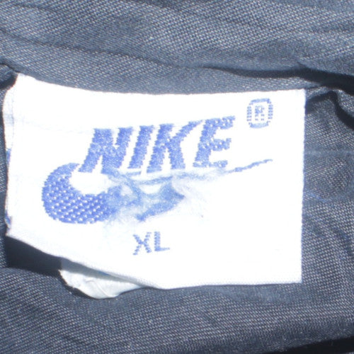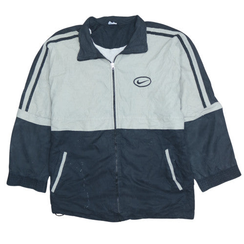 Nike windbreaker, Nike jacket, Nike track jacket, Nike outerwear, Nike XL jacket, Nike XLarge, Nike grey navy jacket, grey navy colour block jacket, men's Nike jacket, men's windbreaker, men's track top, embroidered Swoosh jacket, Swoosh logo coat, Nike stripe sleeve jacket, full zip Nike jacket, lightweight sports jacket, casual sportswear jacket, zip pockets jacket, elasticated cuffs jacket, stand collar jacket, colour block windbreaker, oversized Nike jacket, relaxed fit jacket, Nike shell jacket, polyester jacket, Nike running jacket, Nike training jacket, everyday casual jacket, athleisure jacket, Nike vintage style jacket, Nike embroidered logo, Nike back logo, Nike track top XL, Nike men's outerwear, Nike light jacket, spring jacket, autumn jacket, layering piece, sports casual top, street casual jacket, classic Nike design, two tone jacket, navy blue jacket, grey jacket, Nike XL windbreaker, Nike shell top, Nike swoosh back print, Nike logo front, track sports jacket, activewear coat, casual athletic jacket
