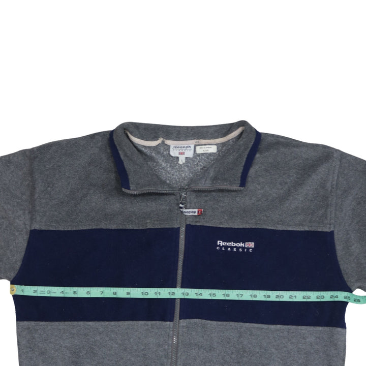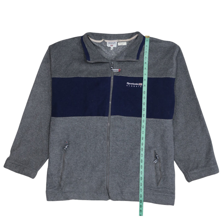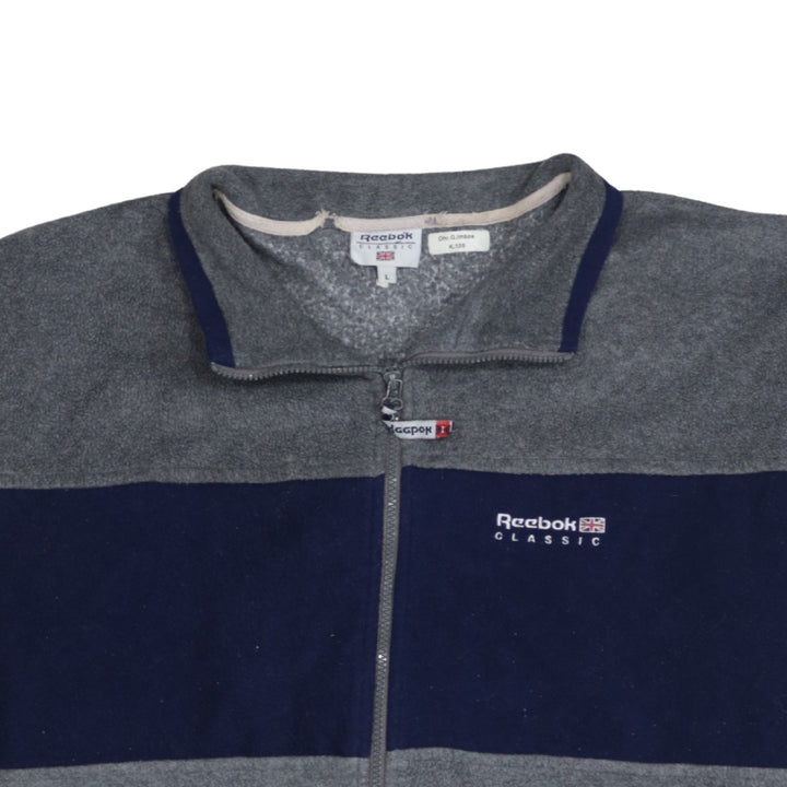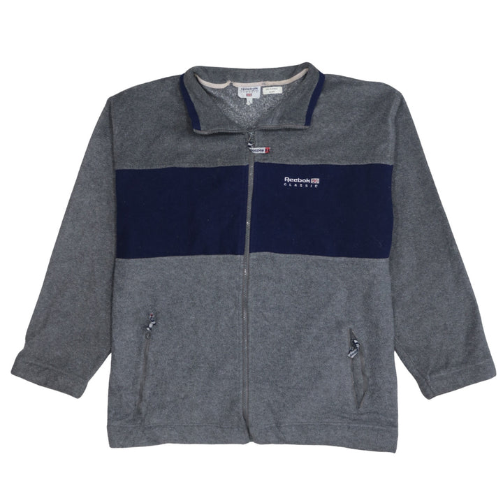 Key Features: Two-tone grey and navy fleece, full zip front, embroidered Reebok Classic logos, zip hand pockets