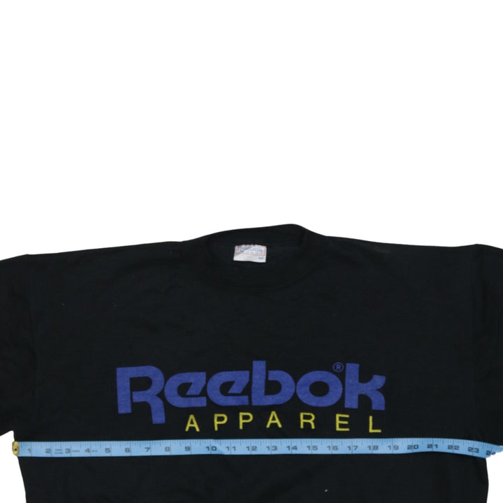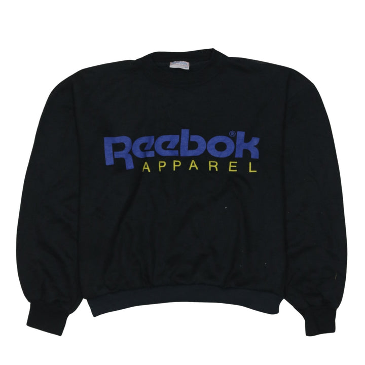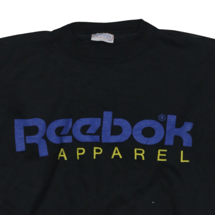 - Large Reebok APPAREL branding across chest in blue and yellow