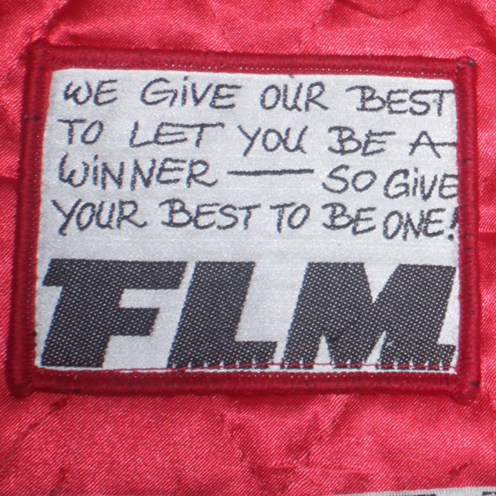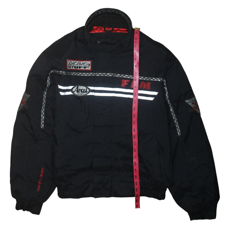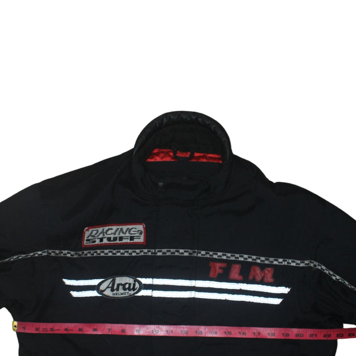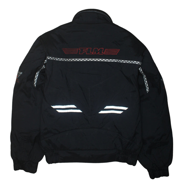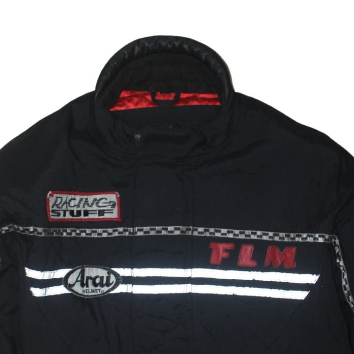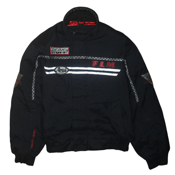 FLM jacket, FLM racing jacket, FLM windbreaker, FLM motorsport coat, black FLM jacket, black racing jacket, men's FLM jacket medium, mens black windbreaker medium, reflective stripe jacket, embroidered logo jacket, motorsport racing coat, track jacket outerwear, biker style jacket, quilted lining jacket, elastic hem cuffs, checkerboard stripe jacket, Arai patch jacket, Racing Stuff patch, casual outerwear, everyday jacket, lightweight windbreaker, polyester jacket, wool blend lining, full zip jacket, medium size jacket, men's casual coat, black sports jacket, racer style jacket, logo embroidered coat, statement jacket, collectible FLM piece, pre-owned FLM jacket, second hand jacket, classic motorsport jacket, black red white jacket, graphic logo jacket, winter outerwear, autumn jacket, spring jacket, layered outfit jacket, street casual jacket, reflective detail coat, zipped pockets jacket, lined windbreaker, comfort fit jacket, relaxed fit outerwear, chest 23 inch jacket, length 25 inch jacket, arm 22 inch sleeve, A Vintage Quality jacket, mens fashion coat