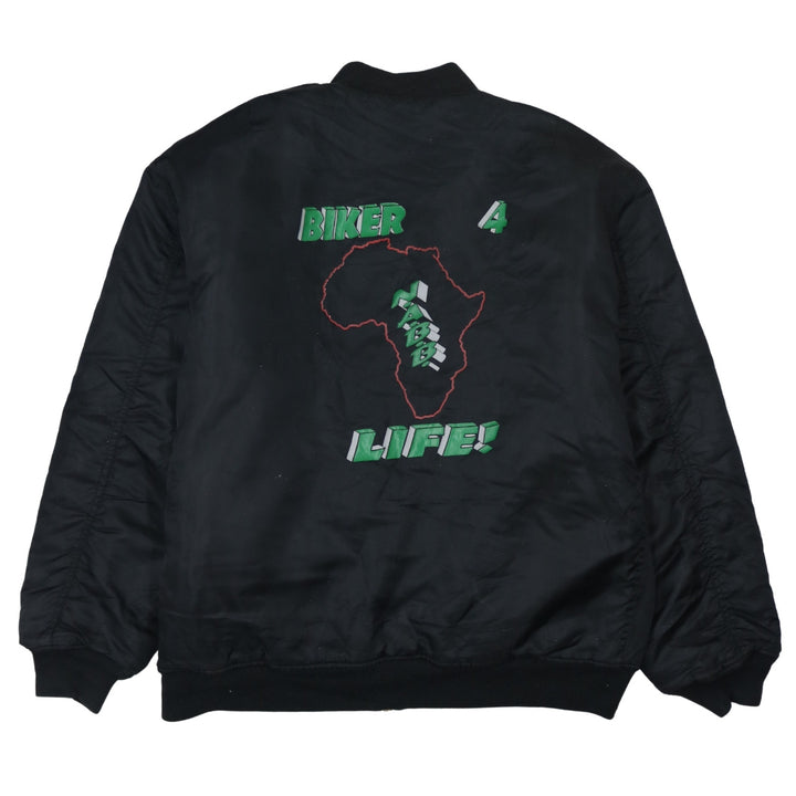 Retro bomber jacket, Retro black bomber, black bomber jacket XXL, mens black bomber, mens XXL bomber jacket, Biker 4 Life jacket, biker graphic jacket, Africa map graphic jacket, printed back bomber, printed bomber jacket, mens windbreaker jacket, casual outerwear, relaxed fit bomber, oversized bomber jacket, orange lining bomber, classic bomber style, ribbed hem jacket, ribbed cuff jacket, zip front bomber, zip sleeve pocket jacket, mens casual jacket, lightweight bomber, polyester bomber jacket, wool blend jacket, mens street jacket, everyday jacket, layering jacket, autumn jacket, winter jacket, mens outerwear XXL, full zip jacket mens, graphic outerwear mens, statement jacket, bold print jacket, biker style outerwear, casual fashion mens, mens coat XXL, black casual coat, versatile black jacket, wardrobe staple jacket, pre-owned bomber jacket, A grade vintage jacket, collectible graphic jacket, mens fashion bomber, comfortable bomber jacket, warm bomber jacket, stylish mens jacket, resale fashion mens, thrifted bomber jacket