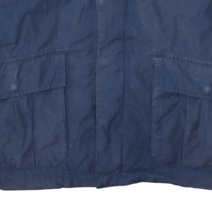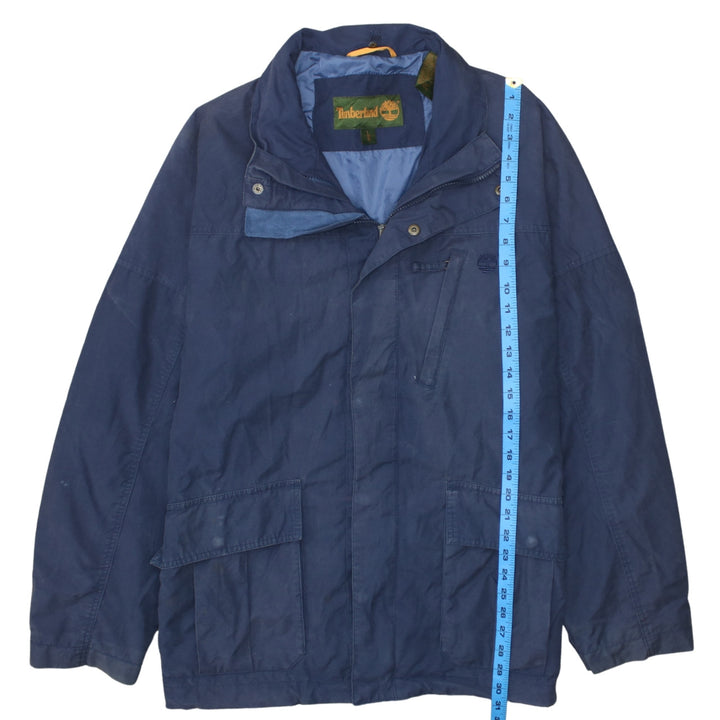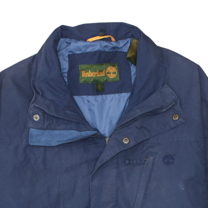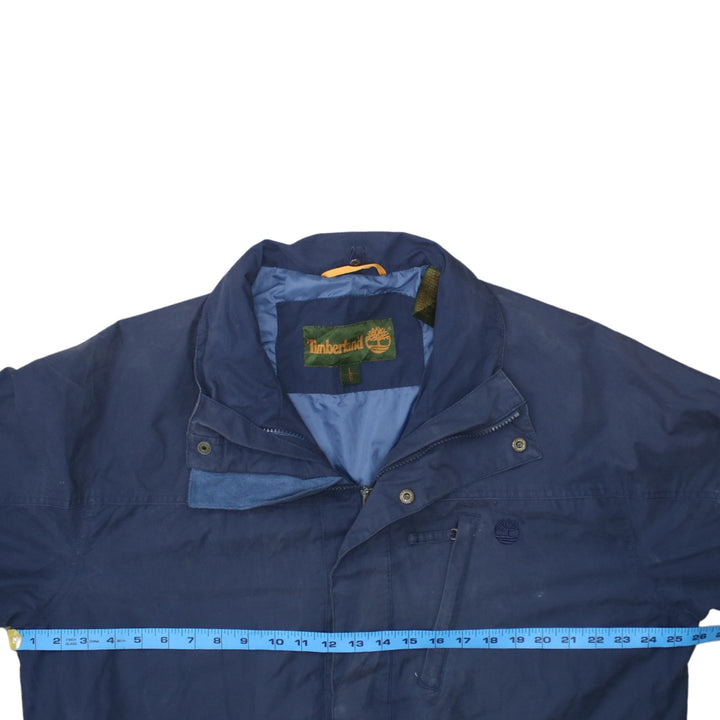Timberland, Timberland jacket, Timberland coat, navy jacket, navy blue jacket, men's jacket, mens coat, men's large jacket, large size jacket, cotton nylon jacket, cotton blend jacket, polyester lining jacket, nylon lining jacket, full zip jacket, zip up jacket, zip front coat, windbreaker, casual outerwear, everyday jacket, navy blue coat, relaxed fit jacket, oversized fit jacket, high collar jacket, stand collar jacket, chest pocket jacket, zip chest pocket, flap pockets, utility style jacket, workwear style jacket, outdoor jacket, casual coat, fall jacket, autumn jacket, winter layering, Timberland outerwear, blue Timberland coat, classic Timberland jacket, 2000s Timberland, embroidered logo jacket, tree logo jacket, longline jacket, hip length jacket, street casual coat, layering piece, second hand Timberland, pre-owned Timberland, A grade condition jacket