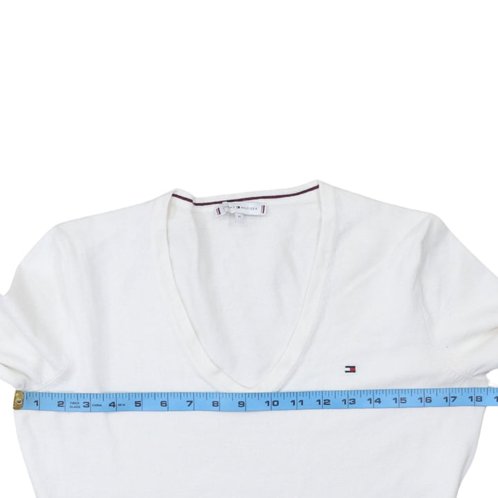 Tommy Hilfiger White Jumper Women's Medium V Neck Embroidered Flag Logo Knit Sweater