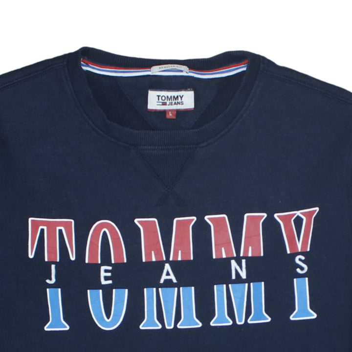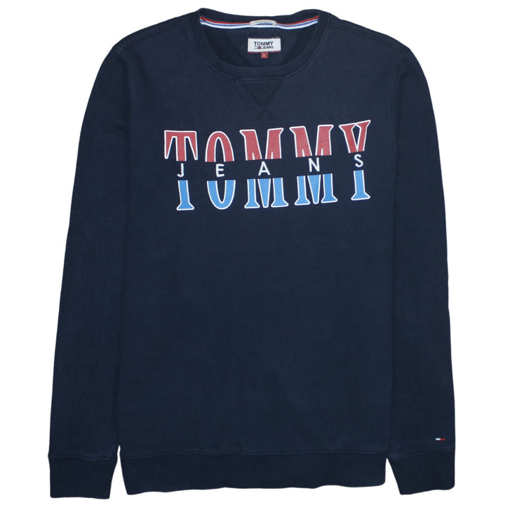 Tommy Jeans, Tommy, Tommy Hilfiger, navy blue sweatshirt, navy crewneck, men's sweatshirt, men's large, L size, spellout logo, big logo, printed logo, crew neck jumper, fleece sweatshirt, pullover top, long sleeve top, casual sweatshirt, relaxed fit, oversized fit, cotton blend, fleece lining, ribbed cuffs, ribbed hem, ribbed collar, classic logo, graphic sweatshirt, logo jumper, men's casual wear, everyday sweatshirt, loungewear top, layering piece, branded sweatshirt, designer sweatshirt, navy sweater, Tommy flag logo, spell out, large size sweatshirt, pre-owned Tommy, classic Tommy Jeans style, men's pullover, crewneck fleece, comfy sweatshirt, essential sweatshirt, wardrobe staple, casual outfit, street casual look, navy blue top, winter layer, autumn layer
