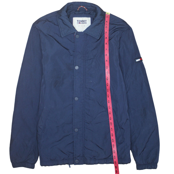 Tommy Jeans, Tommy Hilfiger, navy jacket, navy blue windbreaker, men's small jacket, men's small windbreaker, lightweight jacket, casual outerwear, snap front jacket, zip front jacket, elastic hem jacket, elastic cuffs, sleeve flag logo, logo patch sleeve, Tommy flag, coach style jacket, track jacket, minimalist jacket, plain navy coat, polyester jacket, wool blend lining, A grade condition, pre-owned Tommy jacket, classic Tommy Jeans, men's casual coat, everyday jacket, layering piece, spring jacket, autumn jacket, festival jacket, commuter jacket, stylish men's outerwear, small size men's coat, relaxed fit jacket, chest 20 inch, length 27 inch, arm 19.5 inch, blue casual jacket, street casual jacket, branded men's jacket, logo outerwear, wind resistant shell, lightweight shell jacket, timeless design, wardrobe staple, second hand Tommy, pre-loved jacket