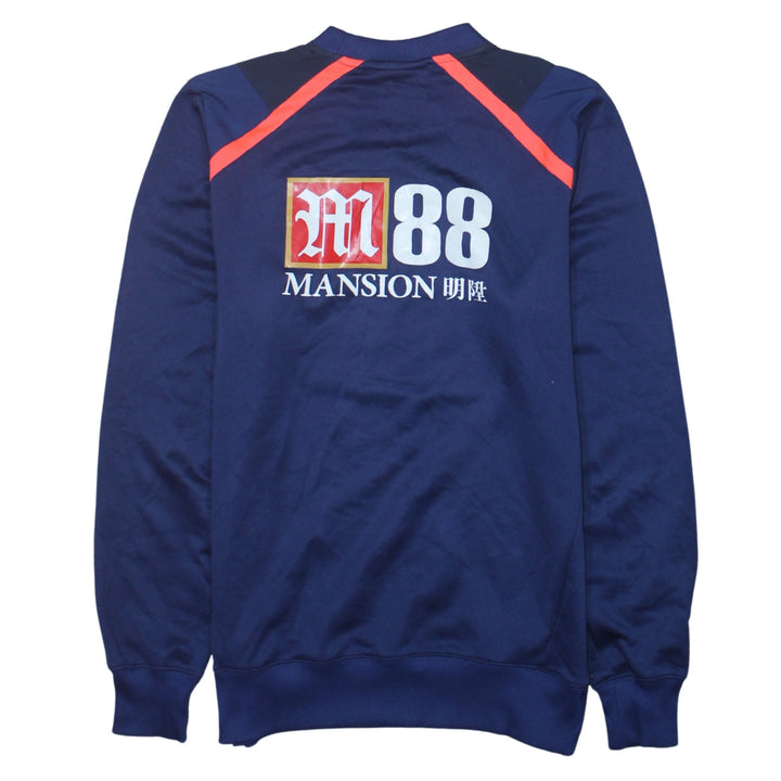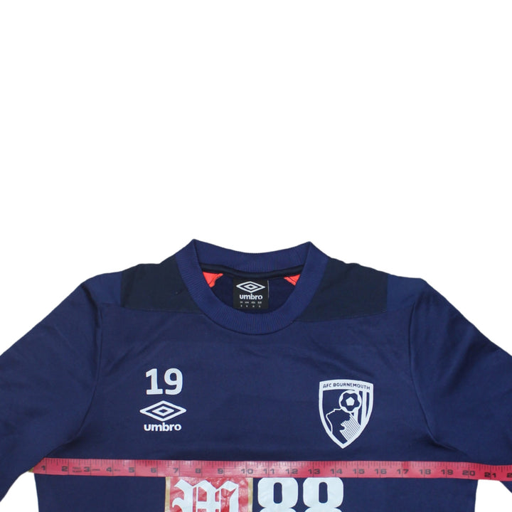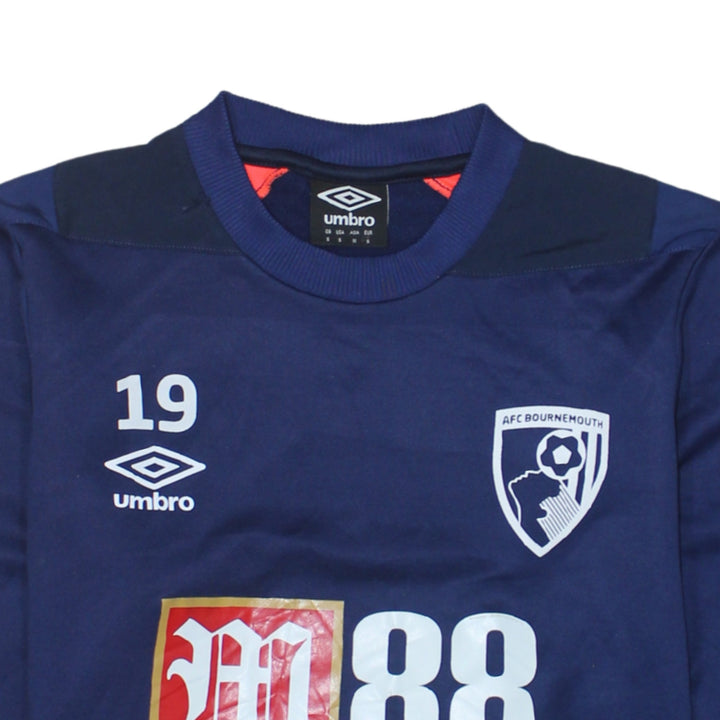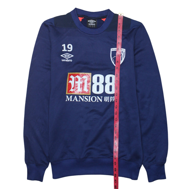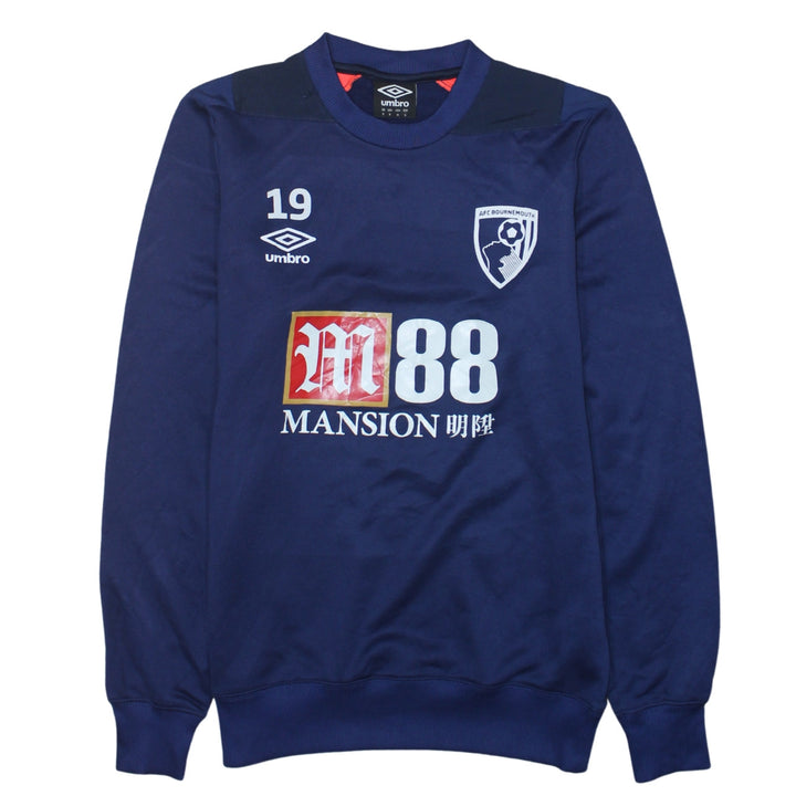 Umbro, Umbro sweatshirt, Umbro training top, Umbro football top, navy blue sweatshirt, navy training jumper, men's Small sweatshirt, men's football sweatshirt, AFC Bournemouth, Bournemouth FC, Cherries, M88 sponsor, Mansion sponsor, long sleeve top, crewneck sweatshirt, pullover jumper, polyester sweatshirt, ribbed cuffs, ribbed hem, ribbed collar, printed sponsor, printed crest, printed logos, football fanwear, supporter gear, training wear, football training jumper, casual sportswear, men's navy top, relaxed fit sweatshirt, layering piece, collectible football top, terrace wear, everyday casual jumper, classic Umbro design, logo sweatshirt, number 19 top, small size men's, sports club sweatshirt, soccer sweatshirt, athletic pullover, comfy jumper