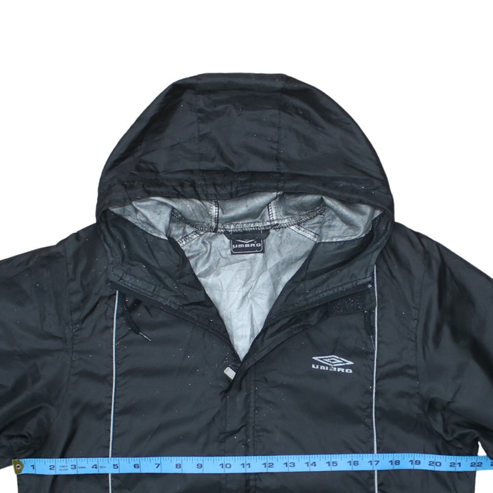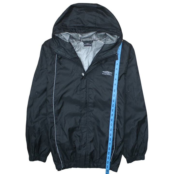 Umbro Black Hooded Windbreaker Men's Small Full Zip Reflective Piping Printed Logo Jacket