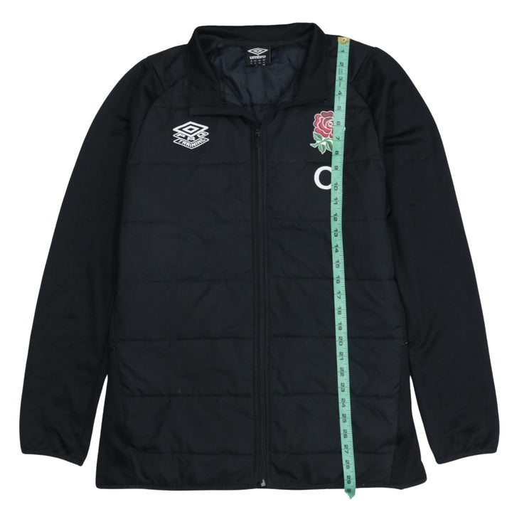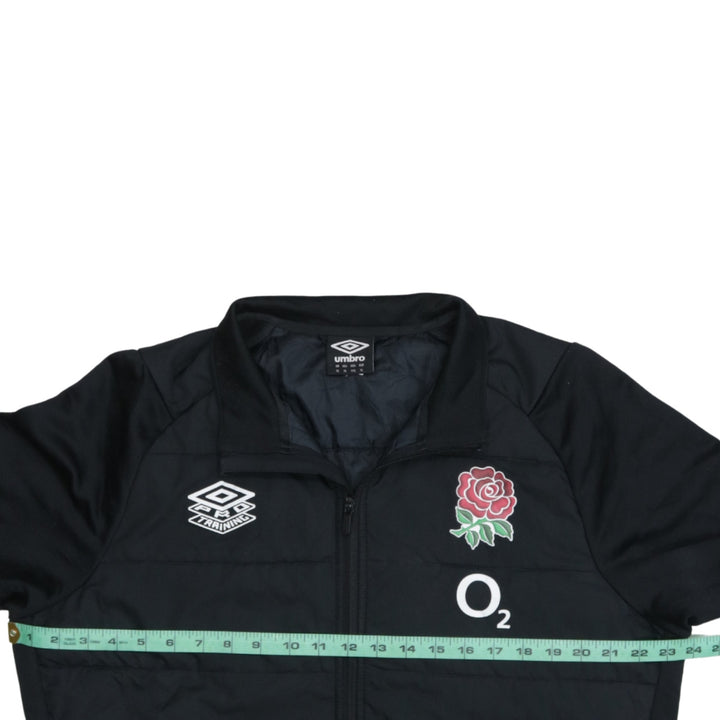 Umbro, Umbro jacket, Umbro padded jacket, Umbro rugby jacket, Umbro England rugby, England rugby jacket, England rose crest, O2 sponsor jacket, black Umbro coat, black padded jacket, men's Umbro jacket, men's black jacket, men's padded coat, size XL jacket, XLarge Umbro, rugby training jacket, rugby outerwear, full zip jacket, quilted jacket, insulated jacket, sports jacket, casual jacket, supporter jacket, England fan gear, rugby union jacket, embroidered logo jacket, sponsored jacket, polyester jacket, lightweight padded coat, relaxed fit jacket, layering piece, autumn jacket, winter jacket, everyday outerwear, training ground jacket, sideline jacket, football style jacket, coach jacket, sports fan clothing, classic Umbro style, black sports coat, long sleeve jacket, stand collar jacket, street casual jacket, menswear, wardrobe staple, pre-owned Umbro, second hand jacket