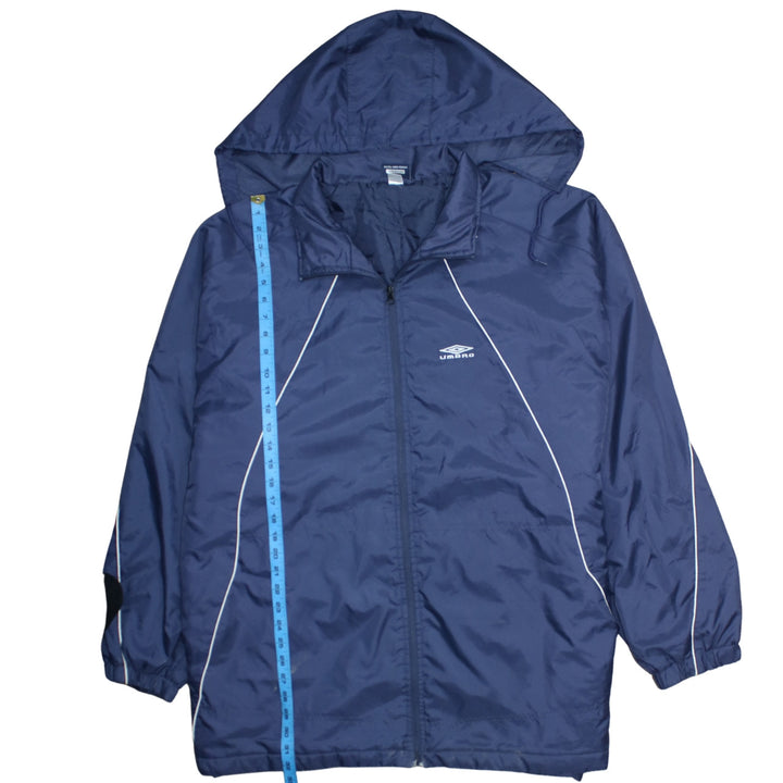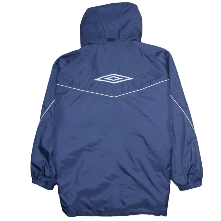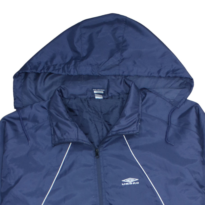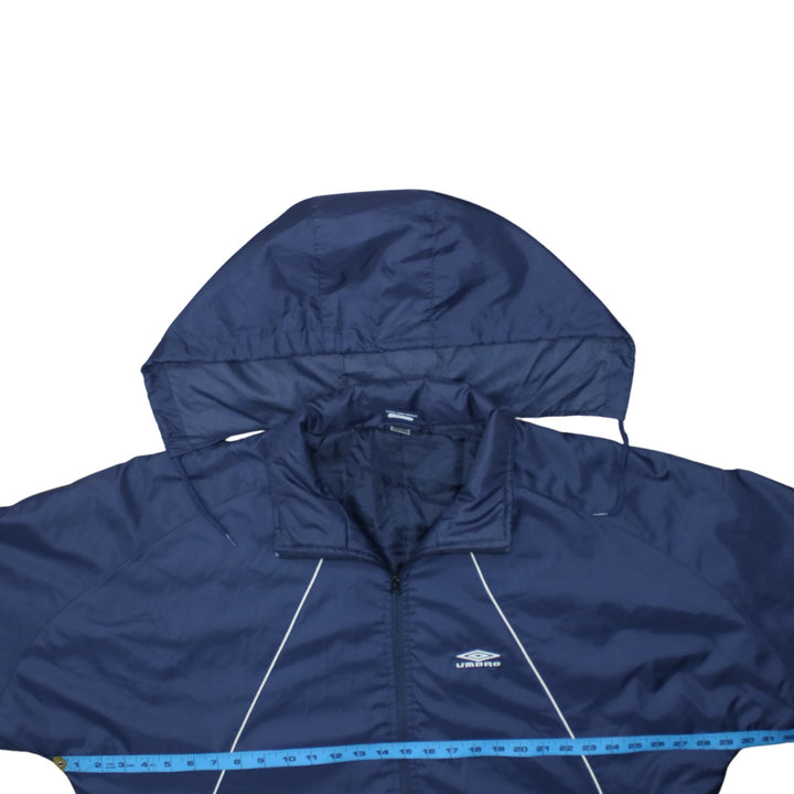 Umbro, Umbro jacket, Umbro windbreaker, Umbro coat, navy blue Umbro, navy jacket, navy windbreaker, hooded jacket, hooded windbreaker, men's Umbro jacket, men's XLarge jacket, XL Umbro, football jacket, training jacket, track jacket, sports jacket, casual outerwear, full zip jacket, zip up jacket, printed logo jacket, logo back print, elasticated cuffs, contrast piping, lightweight shell, polyester lining, padded jacket, terrace wear, football fan coat, athletic outerwear, casual sportswear, men's navy coat, oversized fit jacket, relaxed fit coat, everyday jacket, layering piece, classic Umbro style, men's hooded coat, windproof shell, polyester windbreaker, blue sports jacket, outdoor jacket, training outerwear, coach jacket style, zip front coat, men's casual jacket, football training top, athleisure jacket, Umbro outerwear, navy sports coat