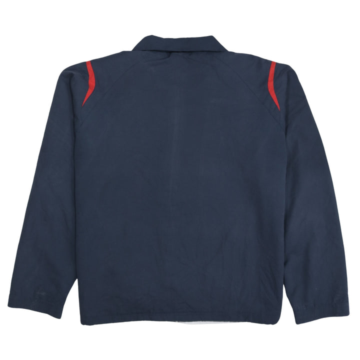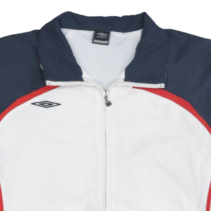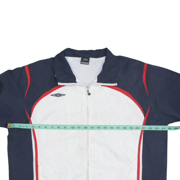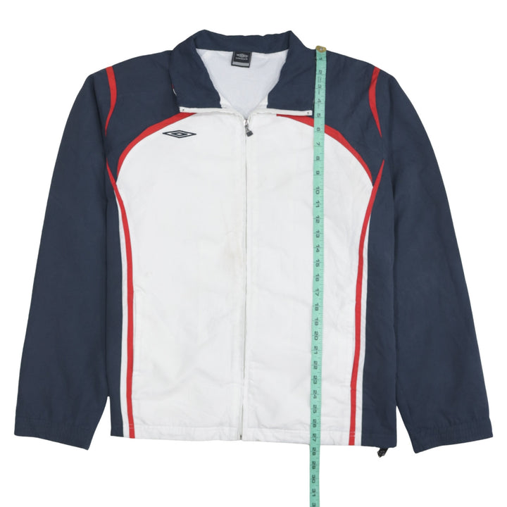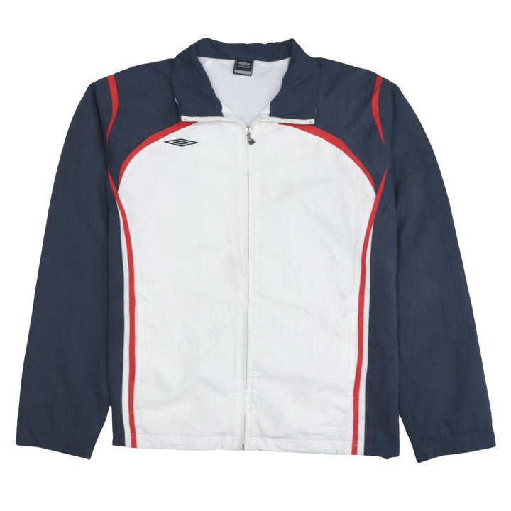 Umbro, Umbro jacket, Umbro windbreaker, Umbro track jacket, Umbro full zip, Umbro navy jacket, navy white jacket, colour block jacket, men's Umbro, men's XLarge jacket, XL jacket, XL windbreaker, polyester jacket, lightweight jacket, casual jacket, sports jacket, training jacket, track top, full zip track top, embroidered logo jacket, contrast panel jacket, mesh lined jacket, long sleeve jacket, stand collar jacket, men's outerwear, casual outerwear, athletic outerwear, football jacket, terrace wear, zip front jacket, navy blue windbreaker, white panel jacket, red piping jacket, relaxed fit jacket, oversized fit jacket, 24 pit to pit, 27 length, 23 sleeve, pre owned Umbro, second hand Umbro, classic Umbro style